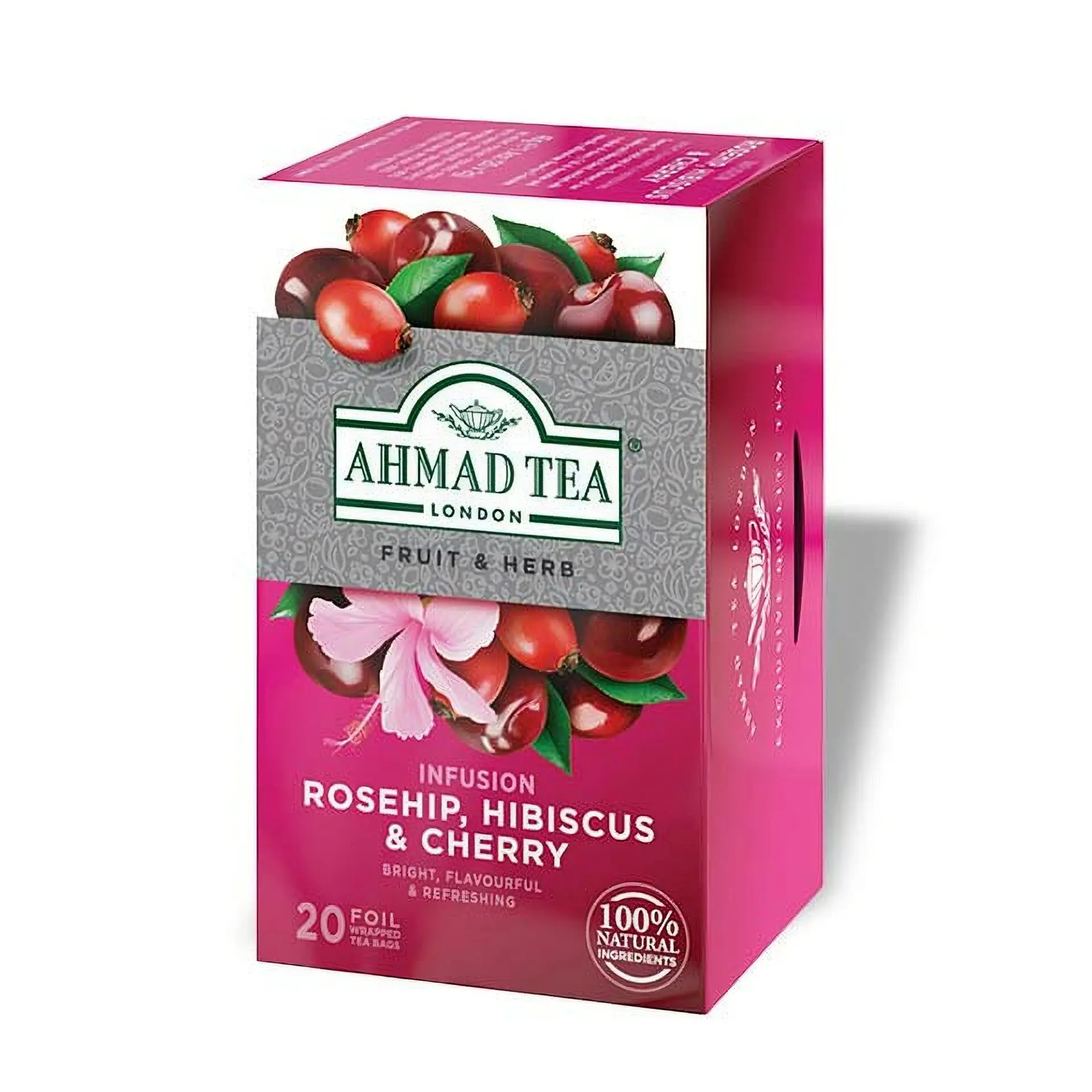 Ein Bild von Ahmad Tea - Rosehip  Hibiscus and Cherry - 20 Teebeutel à 2g, in der Kategorie Früchtetee Tee im Teebeutel kaufen