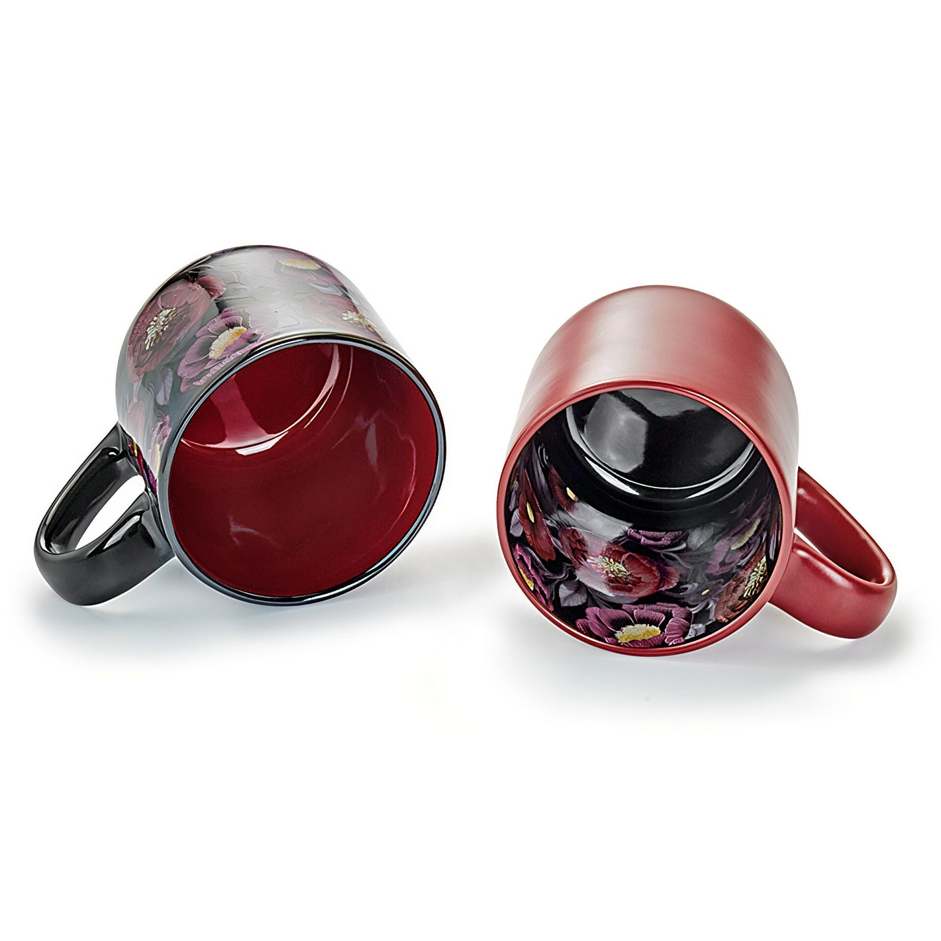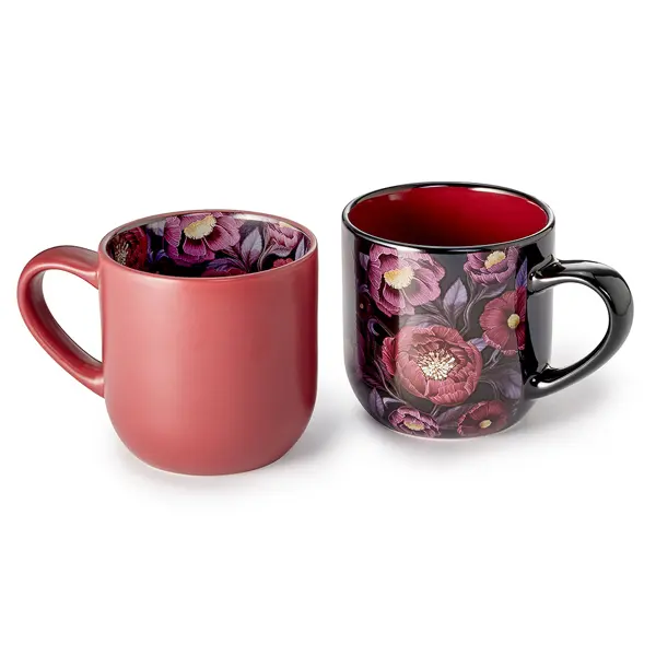 Das edle Design lebt von einem harmonischen Zusammenspiel aus schwarzen Kontrasten und leuchtenden Blüten-Akzenten in Lila und Bordeaux. Goldgelbene Blütenstempel setzen strahlende Highlights und bilden ein optisches Gegengewicht zum dunklen Fond. Der raffinierte Inside-Out-Stil sorgt für ein dynamisches Design – bei einer der Tassen sitzt das Motiv im Inneren und verleiht dem Set eine einzigartige Perspektive.