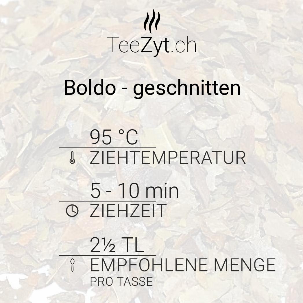 Für einen aromatischen Aufguss etwa 5-6 g Boldo Blätter (3-4 Teelöffel) mit 95°C heissem Wasser übergiessen und 5-10 Minuten ziehen lassen.