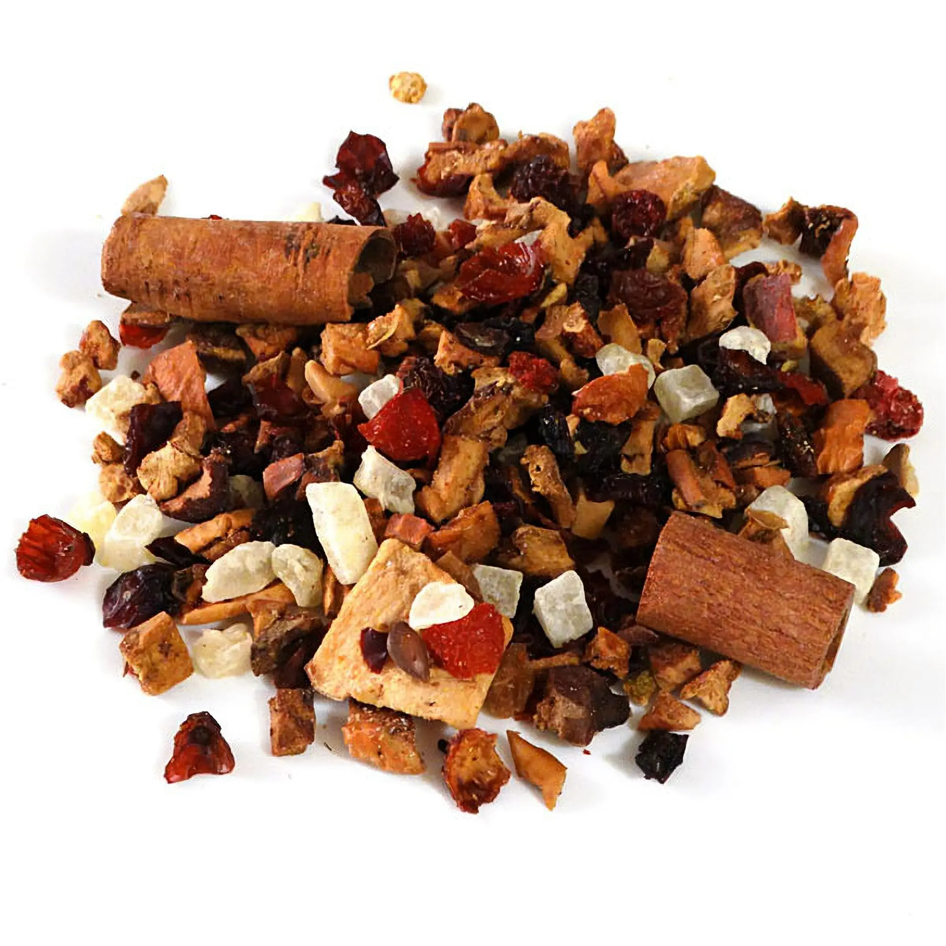 | Zutaten | Apfelstücke, Ananasstücke )Ananas Zucker Säurungsmittel: Zitronensäure), Hagebuttenschalen, Birnenstücke, Karamellstücke (Zucker Kondesmilch Glukosesirup VFollmilchpulver), Aroma, Zitrusschalen, Zimt, Apfelecken, Rote Johannisbeeren |