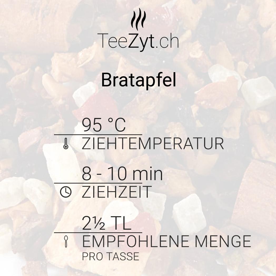 Damit sich alle Aromen optimal entfalten, empfiehlt sich eine Ziehzeit von 8-10 Minuten bei 95°C heissem Wasser. So entwickelt dieser aromatisierte Bratapfel Tee sein volles Geschmackserlebnis.