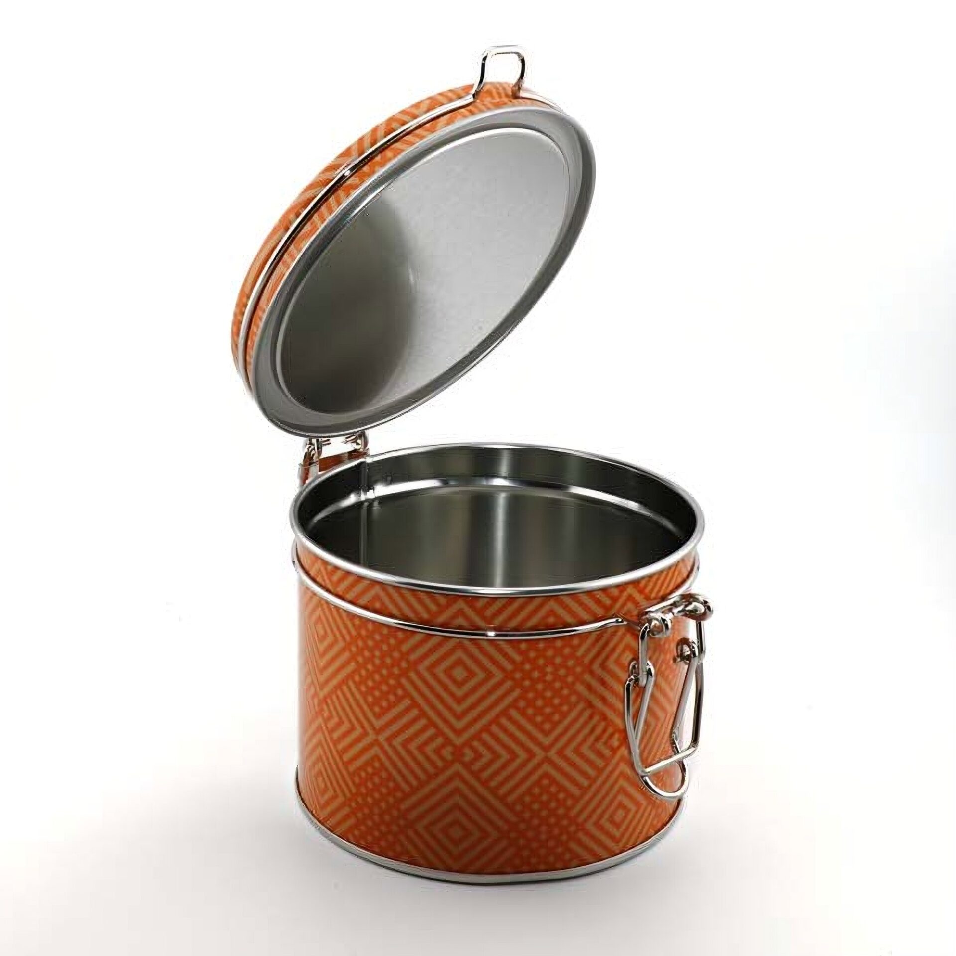 - Runde Bügelverschlussdose aus Weissblech mit auffälligem Design