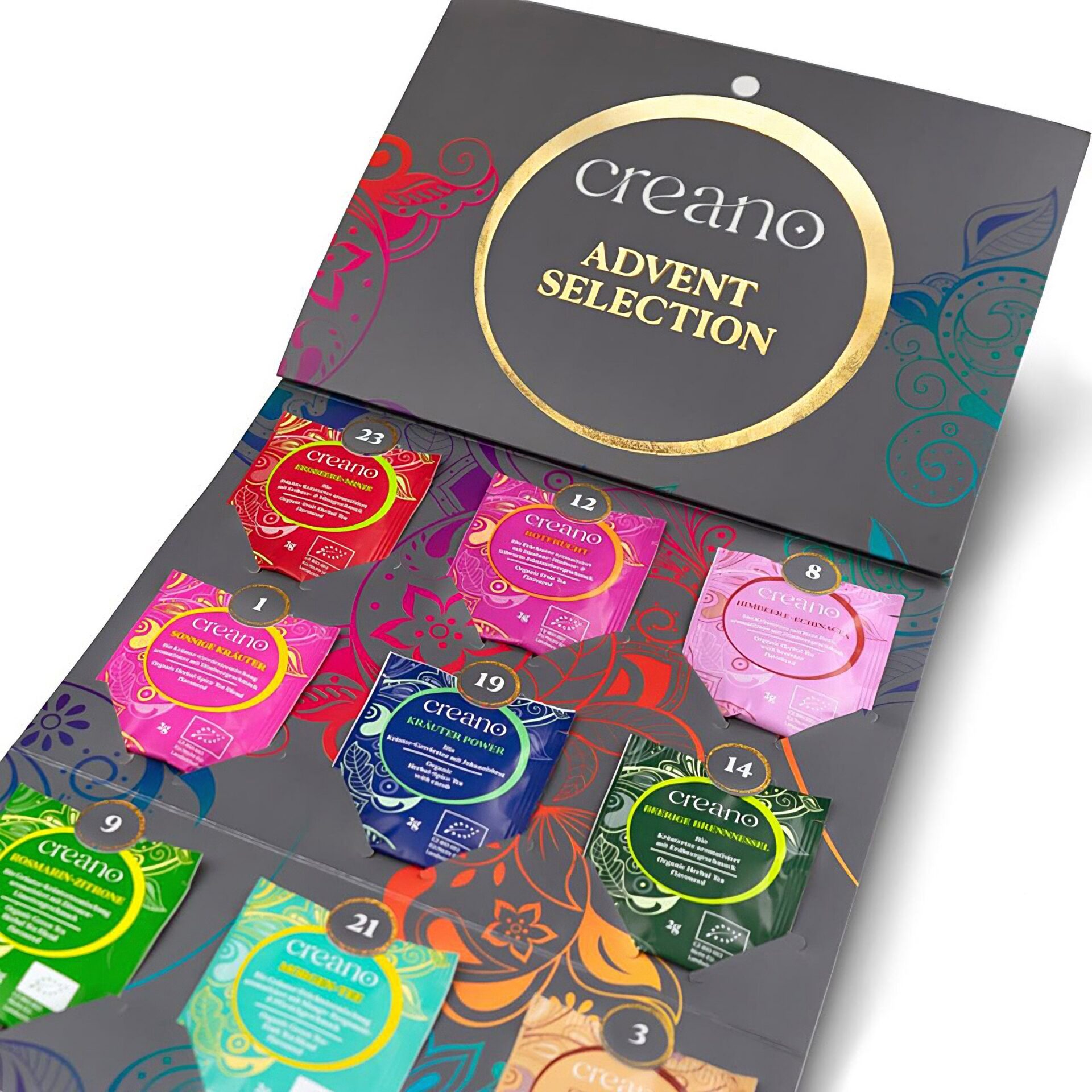 Geniessen Sie die festliche Zeit mit dem exklusiven Adventskalender von Creano, der 24 köstliche Bio-Teebeutel in einer vielseitigen Sortenvielfalt bietet. Entdecken Sie tagtäglich eine neue, wohltuende Tasse Tee und lassen Sie sich von den unterschiedlichen Aromen durch die Adventszeit begleiten. Freuen Sie sich auf eine breite Palette an Geschmacksrichtungen, von wärmenden Gewürztees über fruchtige Kräutermischungen bis hin zu beruhigenden Abendtees.