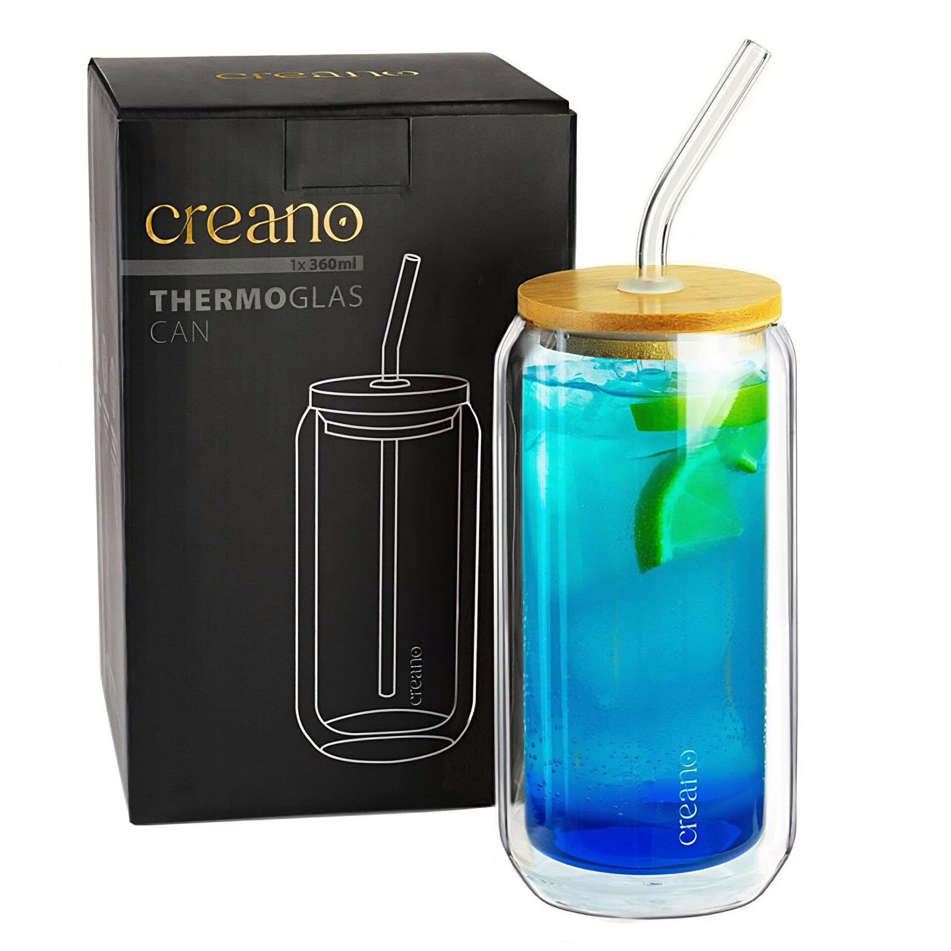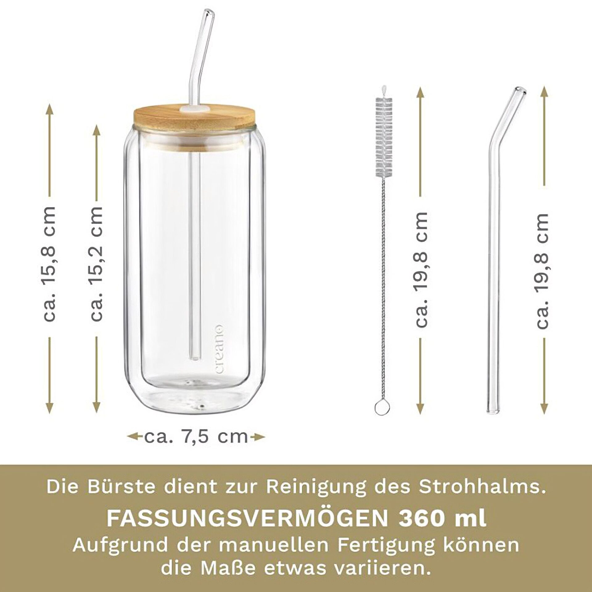 Creano Doppelwandiges Trinkglas 360 ml: Stilvoll, nachhaltig, mit Bambusdeckel und Strohhalm