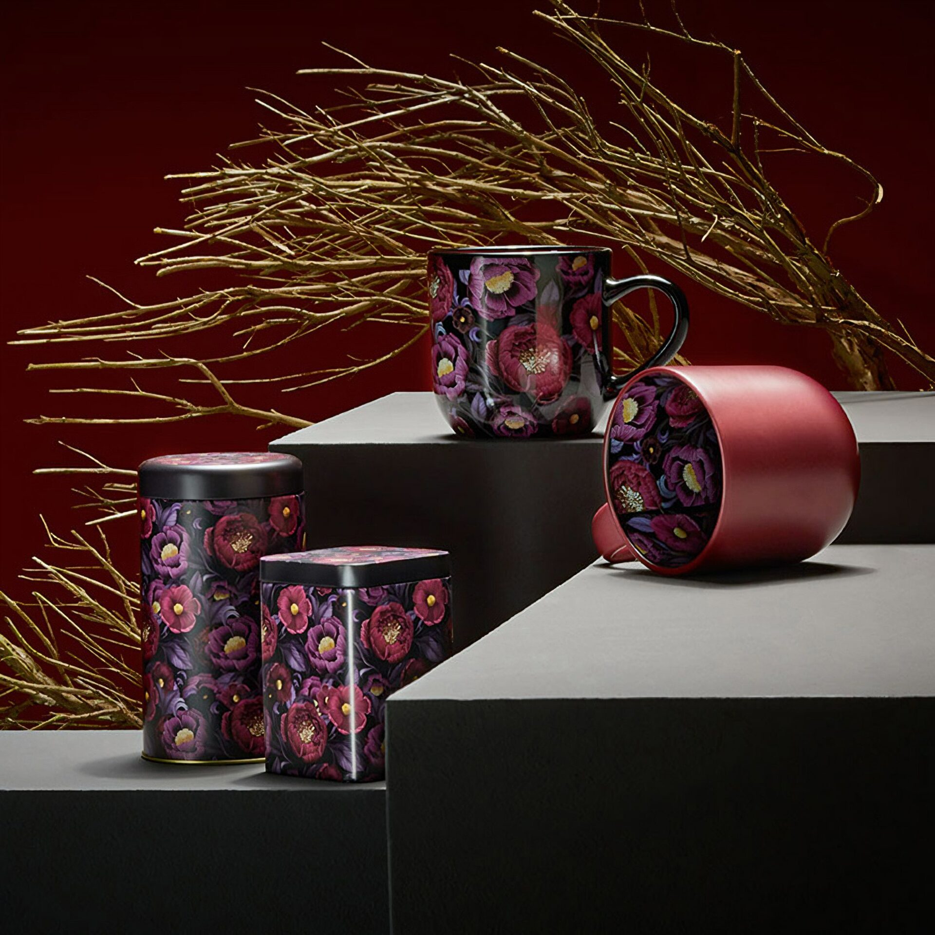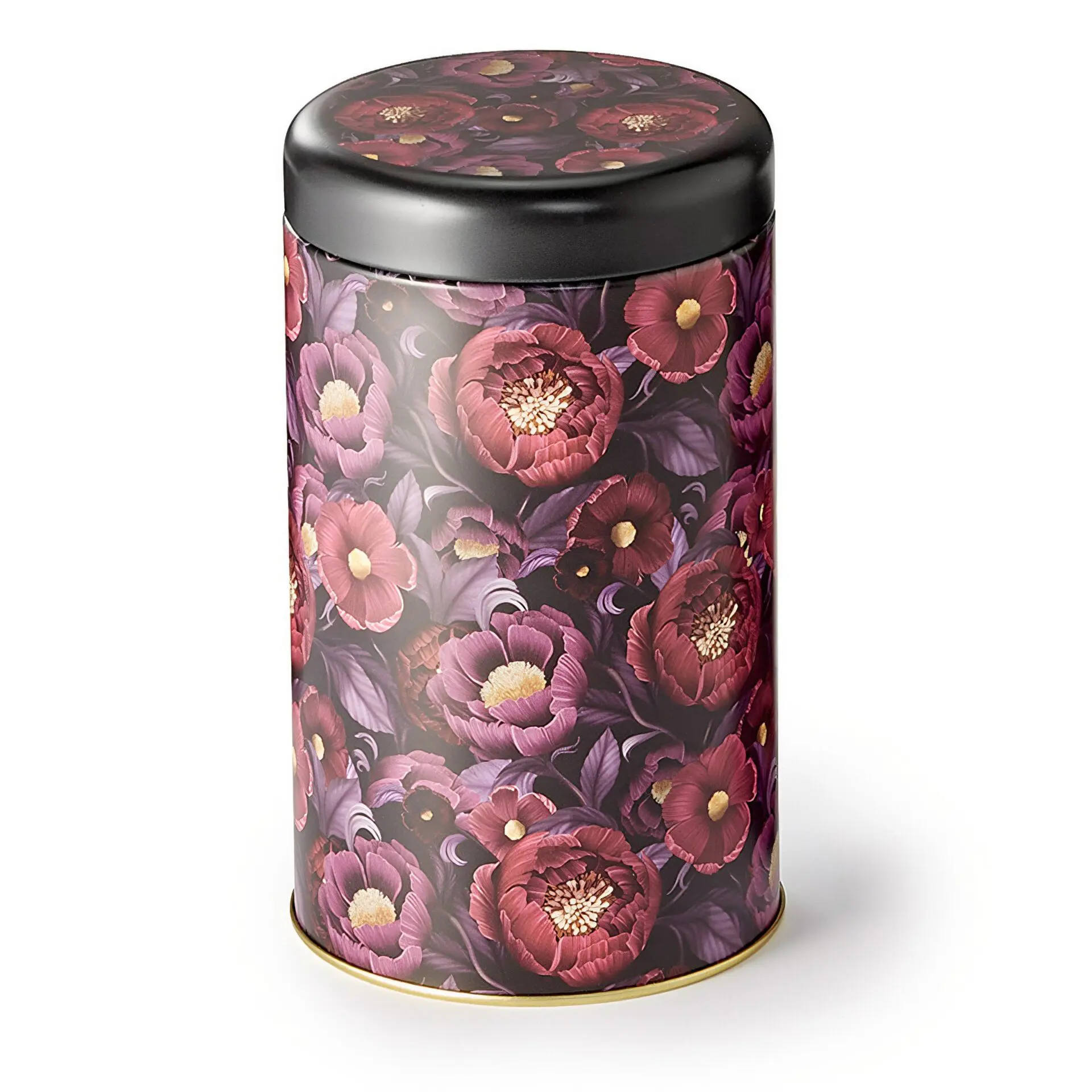 - Elegantes, mystisches Design Teedose mit tiefem Schwarz und leuchtenden Blütentönen