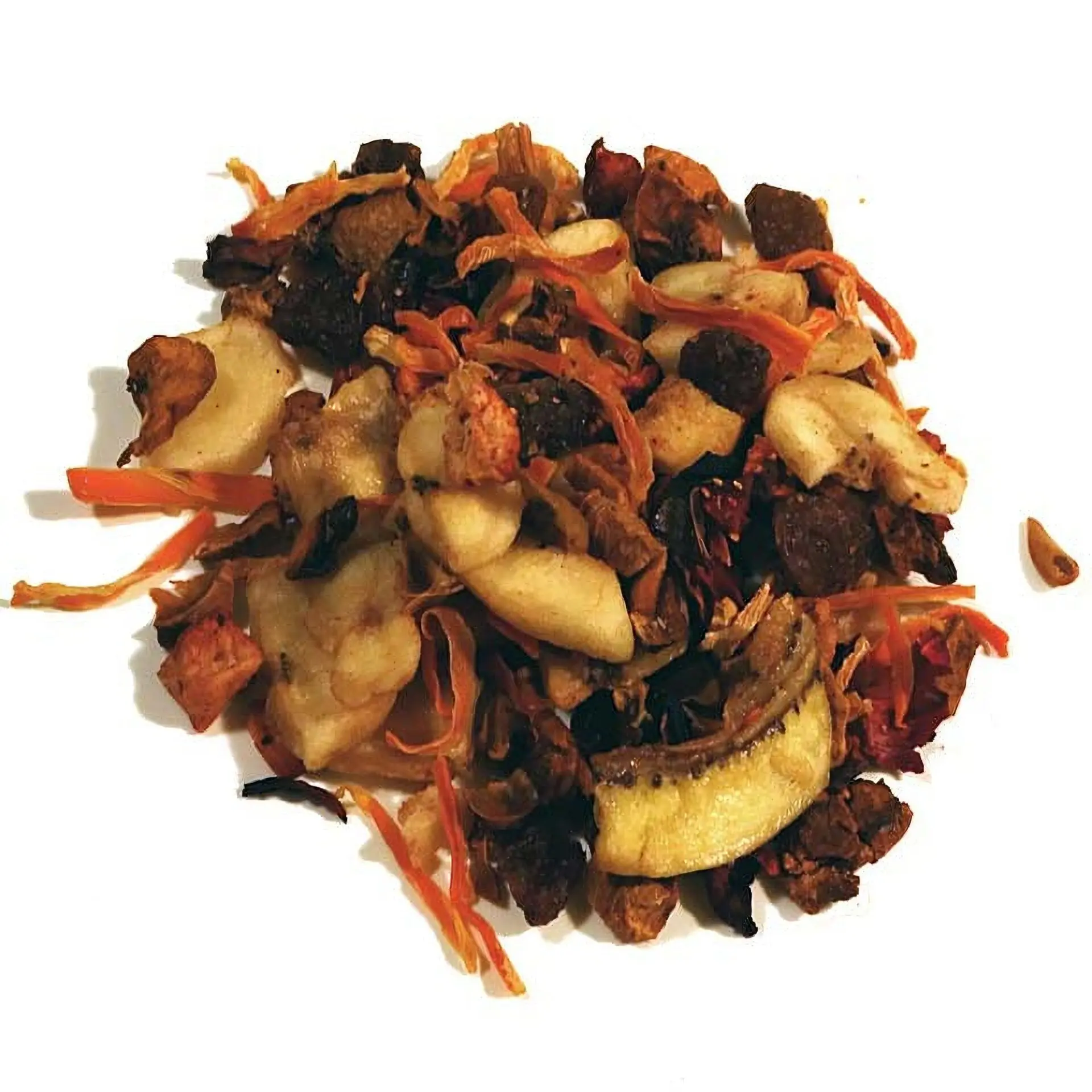 | Zutaten | Apfelstücke, Golden Sultanas (Sultanas, Sonnenblumenöl), Bananenchips (Bananen, Kokosnussöl, Rohrohrzucker) (17,5%), Hibiskus, Karottenscheiben, Süssholzwurzel, Erdbeerstücke (3%), Natürliches Aroma |