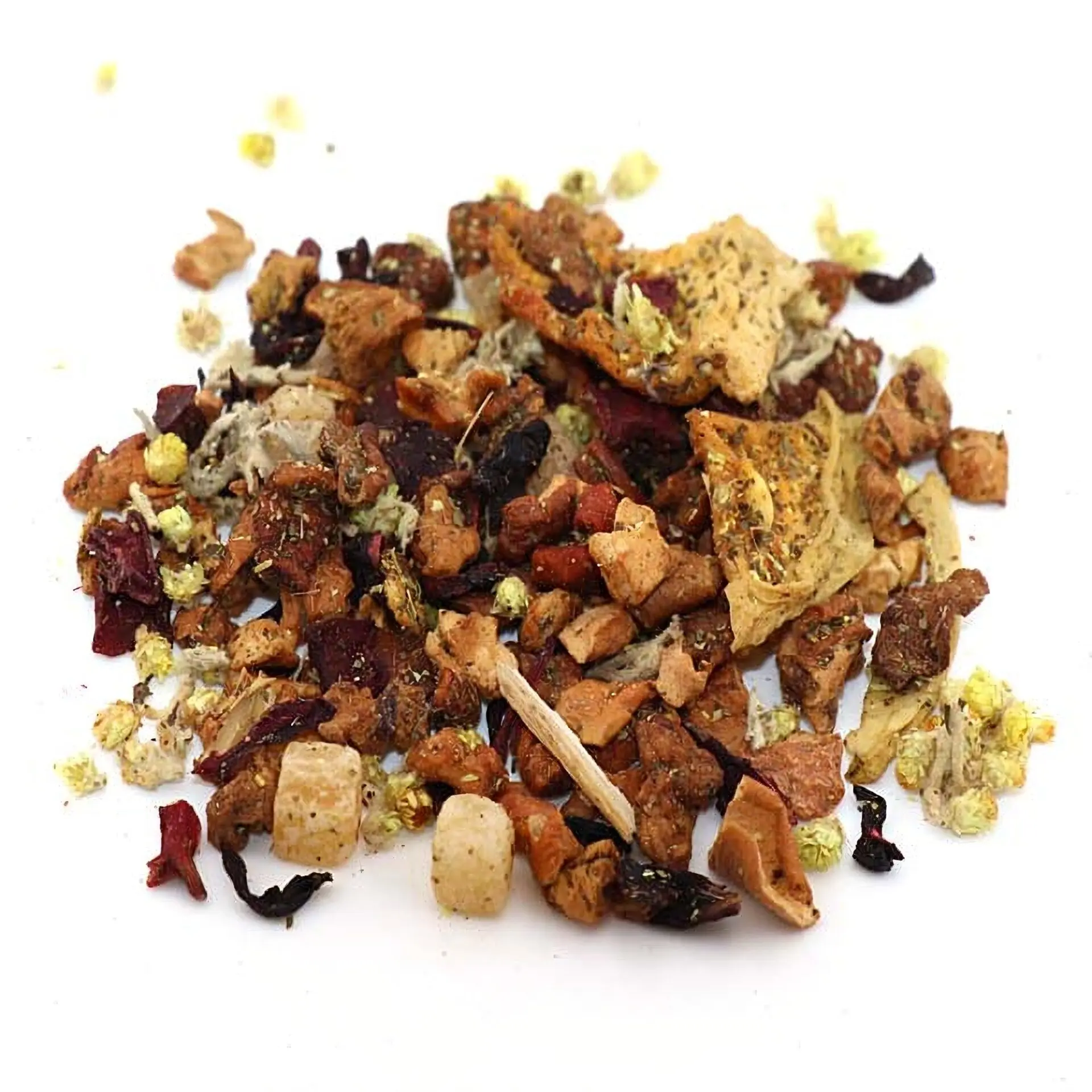 Diese Mischung vereint klassische Zutaten mit überraschenden Nuancen: Apfelstücke und Ananaswürfel sorgen für eine natürliche Süsse, während gesäuerte Apfelstücke und rote Beete für eine angenehme Tiefe im Geschmack sorgen. Katzenpfötchen und süsse Brombeerblätter bringen eine sanfte Milde, Hibiskusblüten und Holunderbeeren geben dem Tee seine feinherbe Dimension.