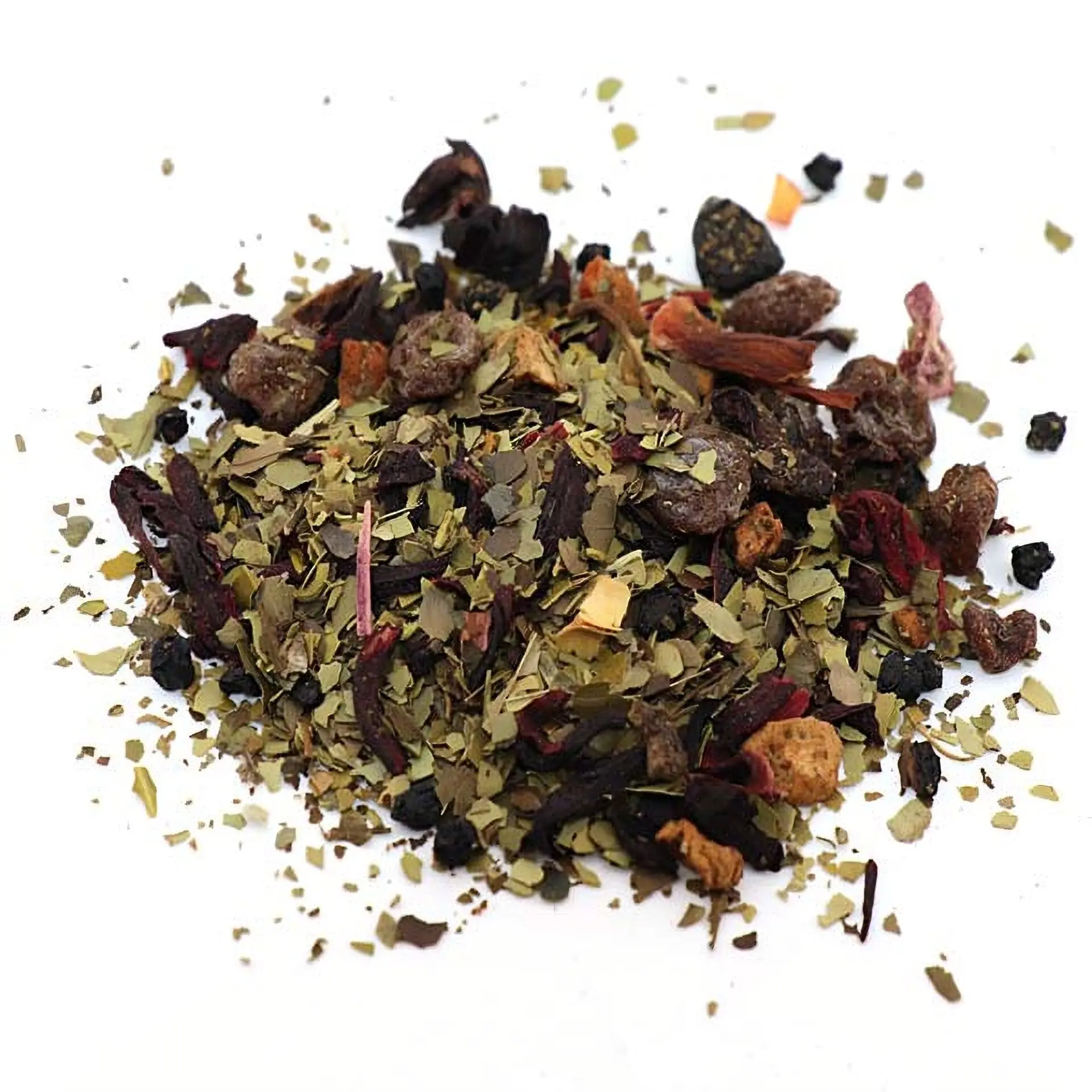 | Zutaten | Sultanas, Brasilien Mate, 14%, Fliederbeeren, Hibiskusblüten, süsse Brombeerblätter, Apfelstücke, Aroma, Guyausa, 4%, Heidelbeeren, schwarze Johannisbeeren |