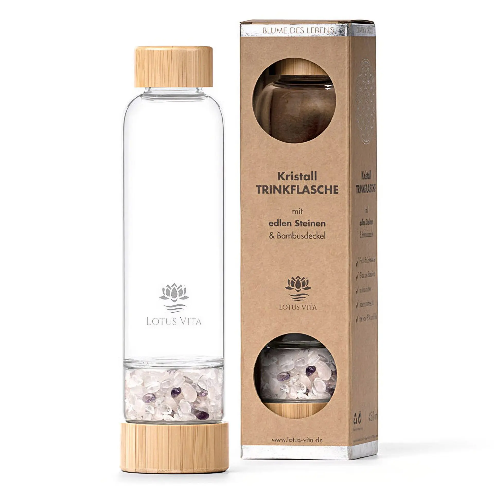Glastrinkflasche mit Kristallsteinen kaufen – Stilvoller Begleiter mit Bergkristall, Rosenquarz & Amethyst