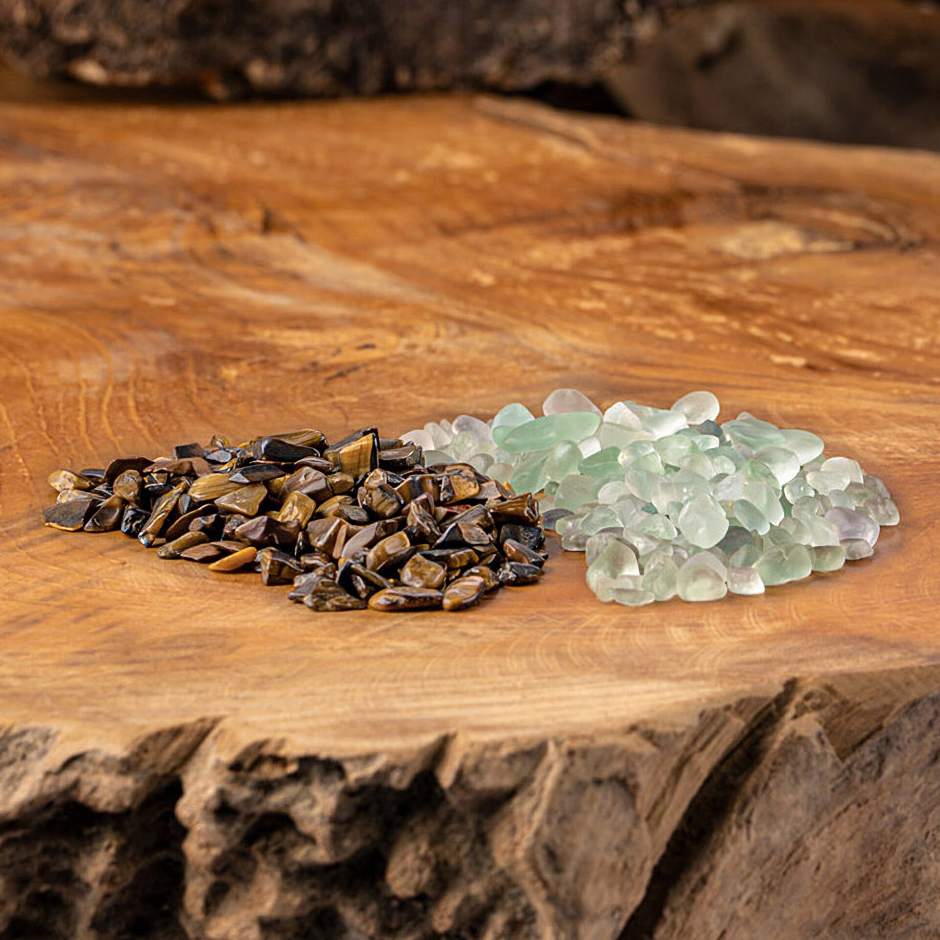 - Befüllt mit Fluorit und Tigerauge – individuell austauschbare Steine