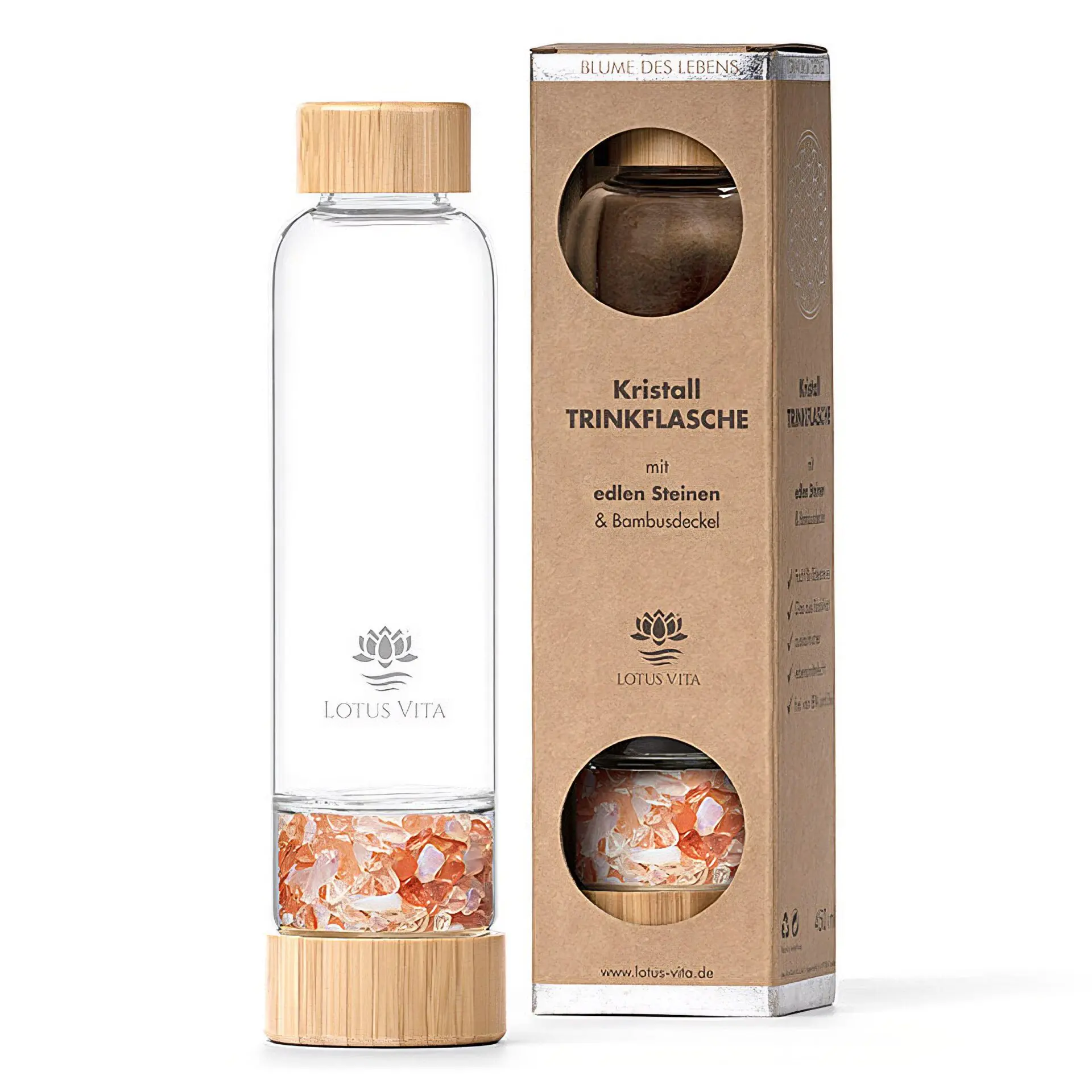 Diese edelstein-trinkflasche mit bambusdeckel stammt von Lotus Vita – einer Marke, die für nachhaltige Verarbeitung und hohe Materialqualität steht. Die verwendeten Kristalle sind von geprüfter Herkunft. Das Glas ist geschmacksneutral, robust und BPA-frei.
