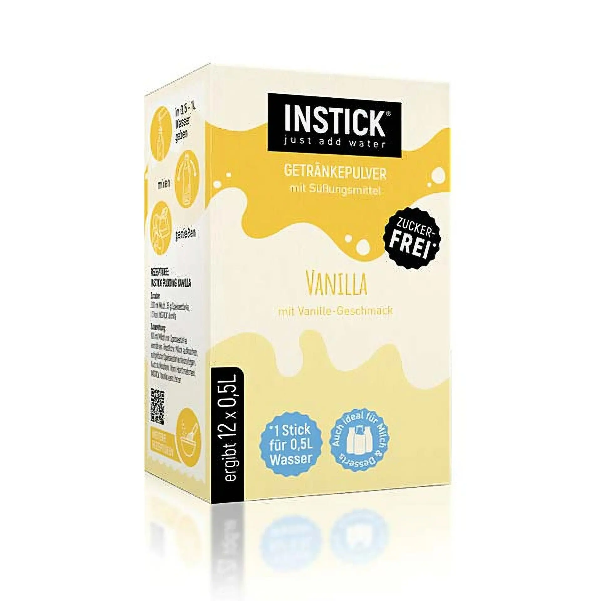 Das Instick Milk Vanille Geschmack Pulver enthält keine zugesetzten Zucker, ist laktosefrei und von Natur aus veganes Nahrungsmittel.