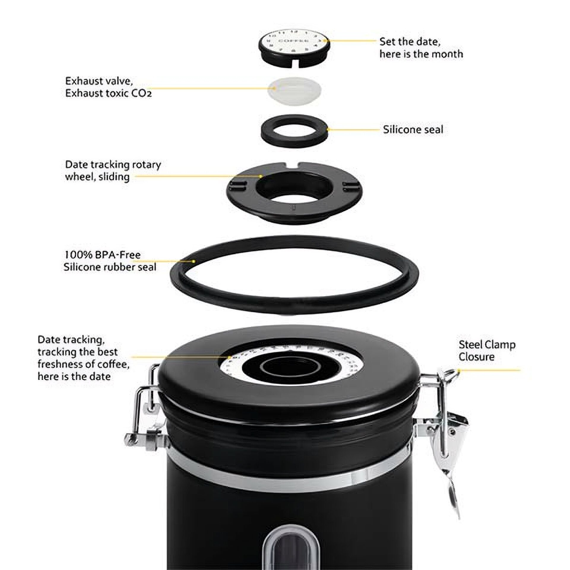Durch das integrierte Sichtfenster zeigt sich der aktuelle Füllstand jederzeit auf einen Blick. Der Aromadeckel verfügt über eine praktische Datumsanzeige, die dabei unterstützt, Frischezeiträume besser im Auge zu behalten – besonders hilfreich beim Lagern empfindlicher Lebensmittel wie Kaffee oder Tee.