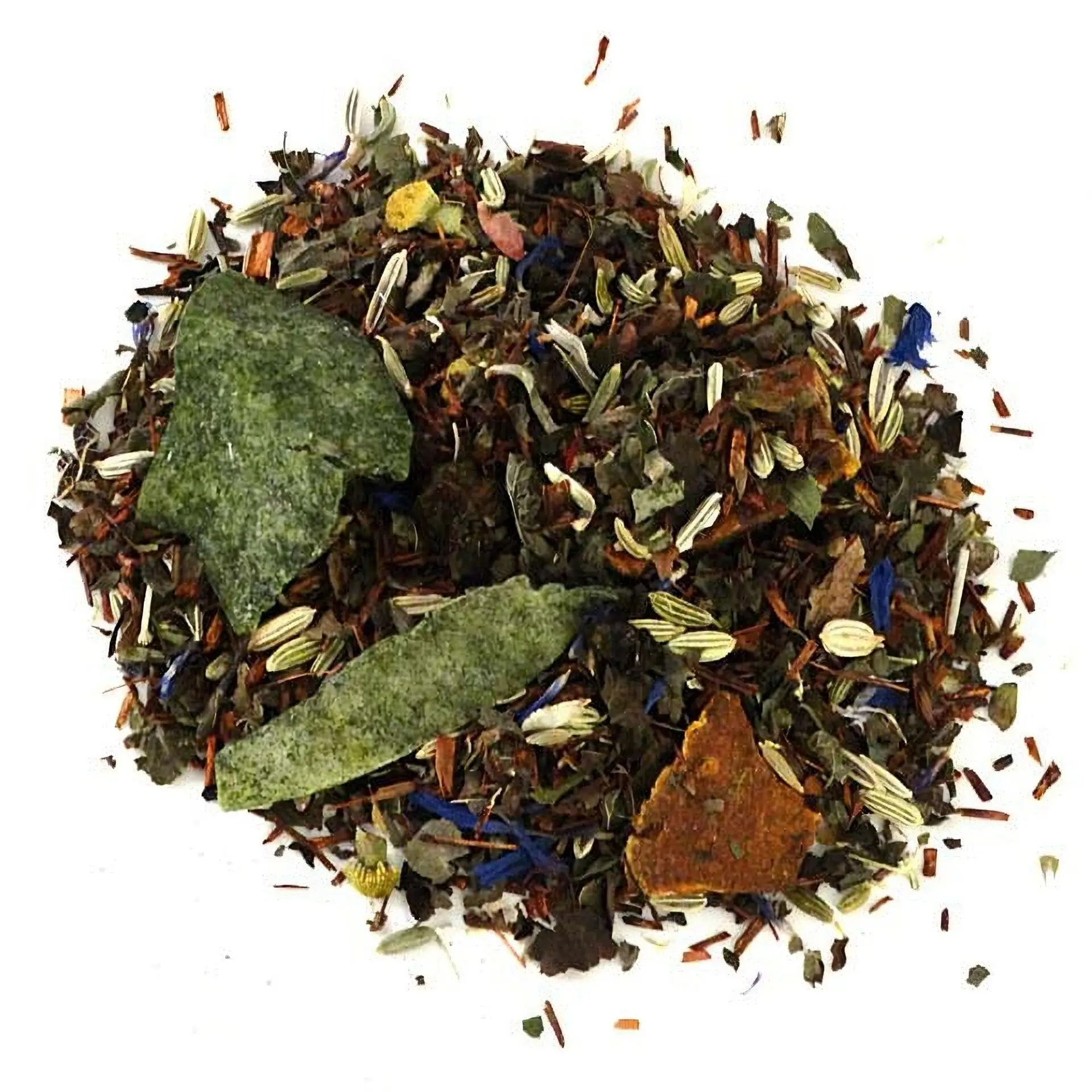 | Zutaten | Rotbuschtee, Fenchel, Zitronenmelisse, Kokoschips, Sanddornbeeren, Kandierte Aloe Vera, Kamille, Kurkumascheiben, Brombeerblätter, Pfefferminz, Kornblumenblüten, Chlorella Algenpulver (1%) |