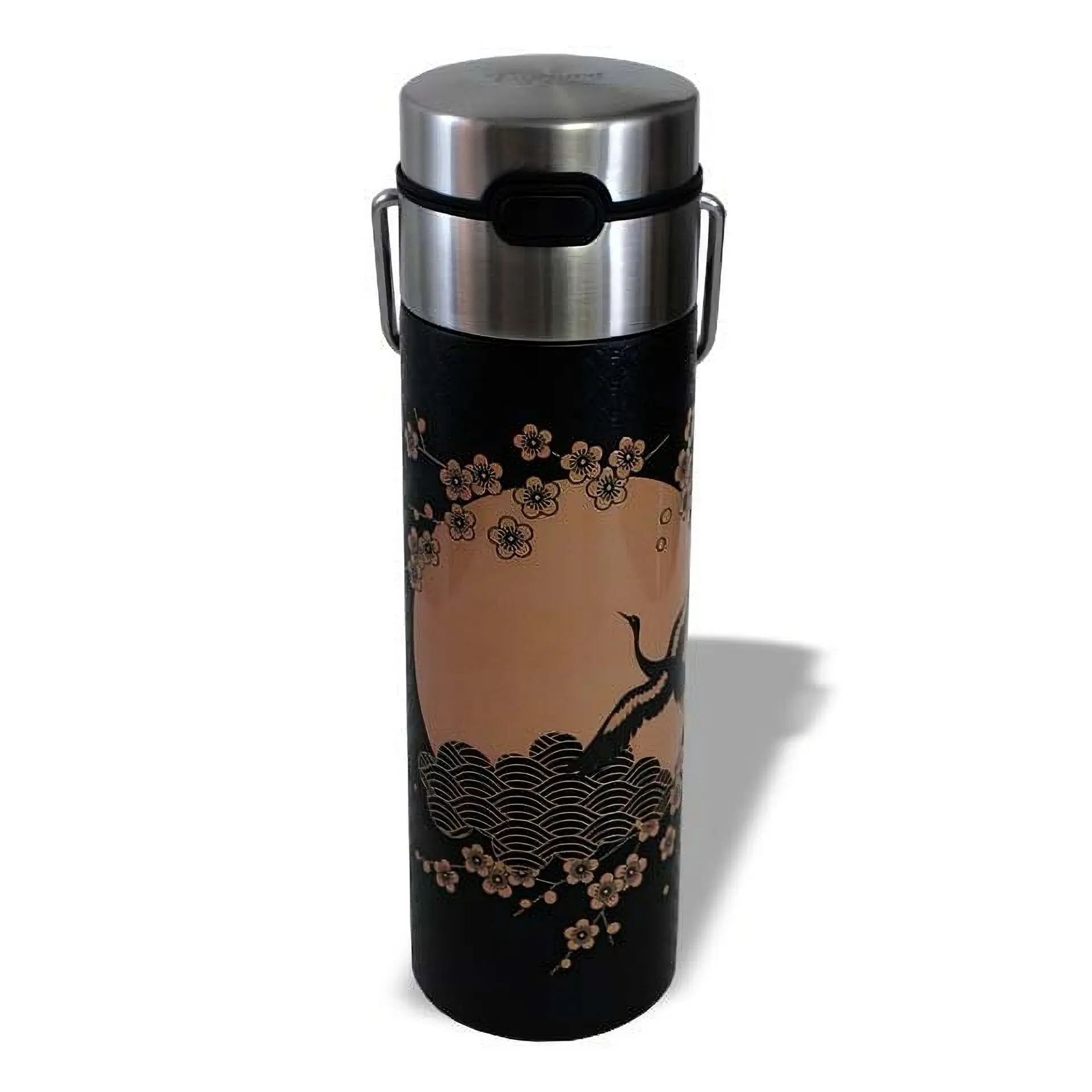 Die Kombination aus Edelstahl und hochwertigem Prägedruck verleiht dieser asiatischen Design Trinkflasche eine luxuriöse Optik. Ihre doppelwandige Bauweise hält Getränke lange warm oder kalt, während das Edelstahlsieb die Teezubereitung direkt in der Flasche ermöglicht.