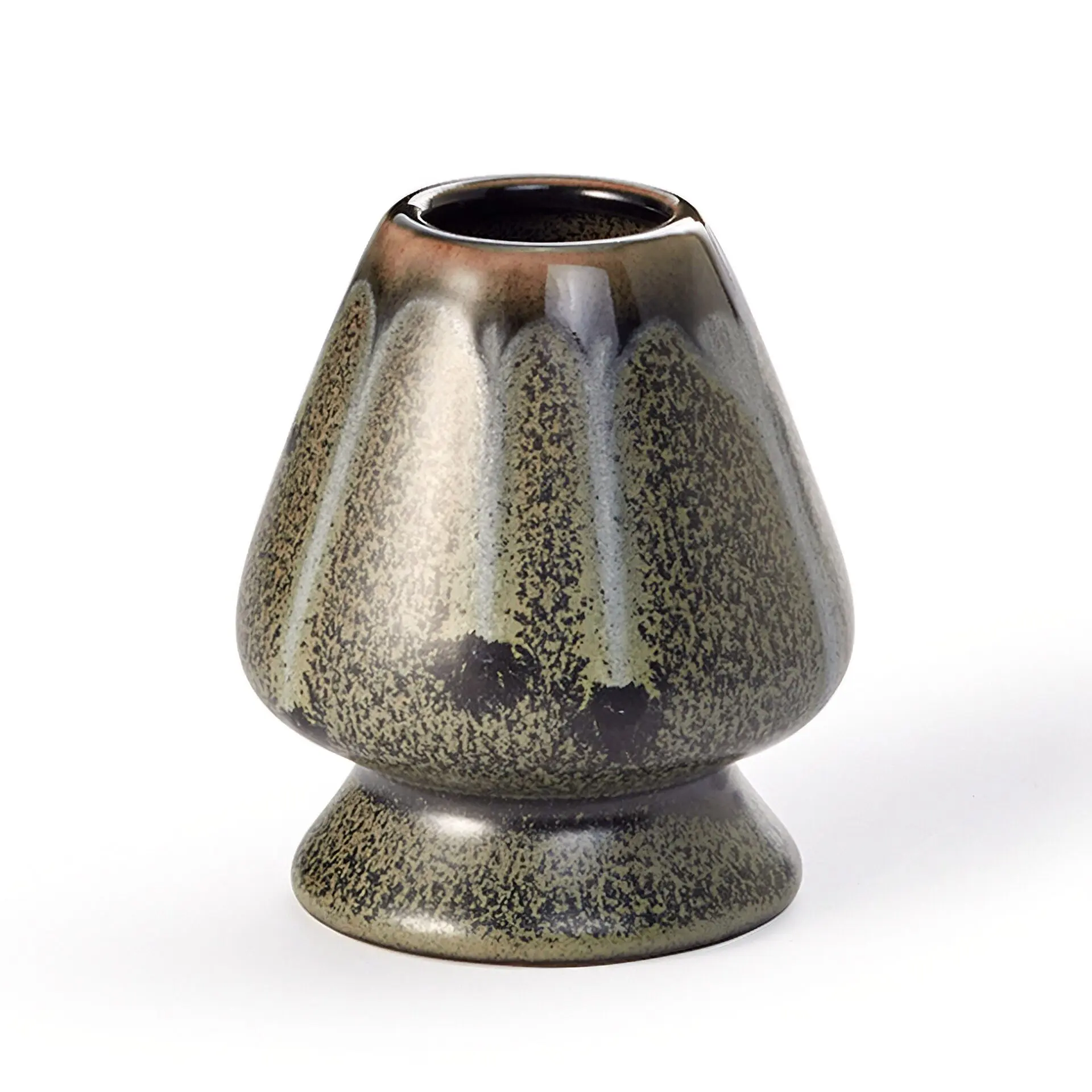 Dank des dickwandigen Porzellans steht der Halter besonders stabil. Die hochwertige Oberfläche mit exklusiver Reactive Glaze in natürlichen Grün- und Brauntönen harmoniert wunderbar mit dem Bambus des Besens und passt perfekt zu vielen Matcha-Schalen.