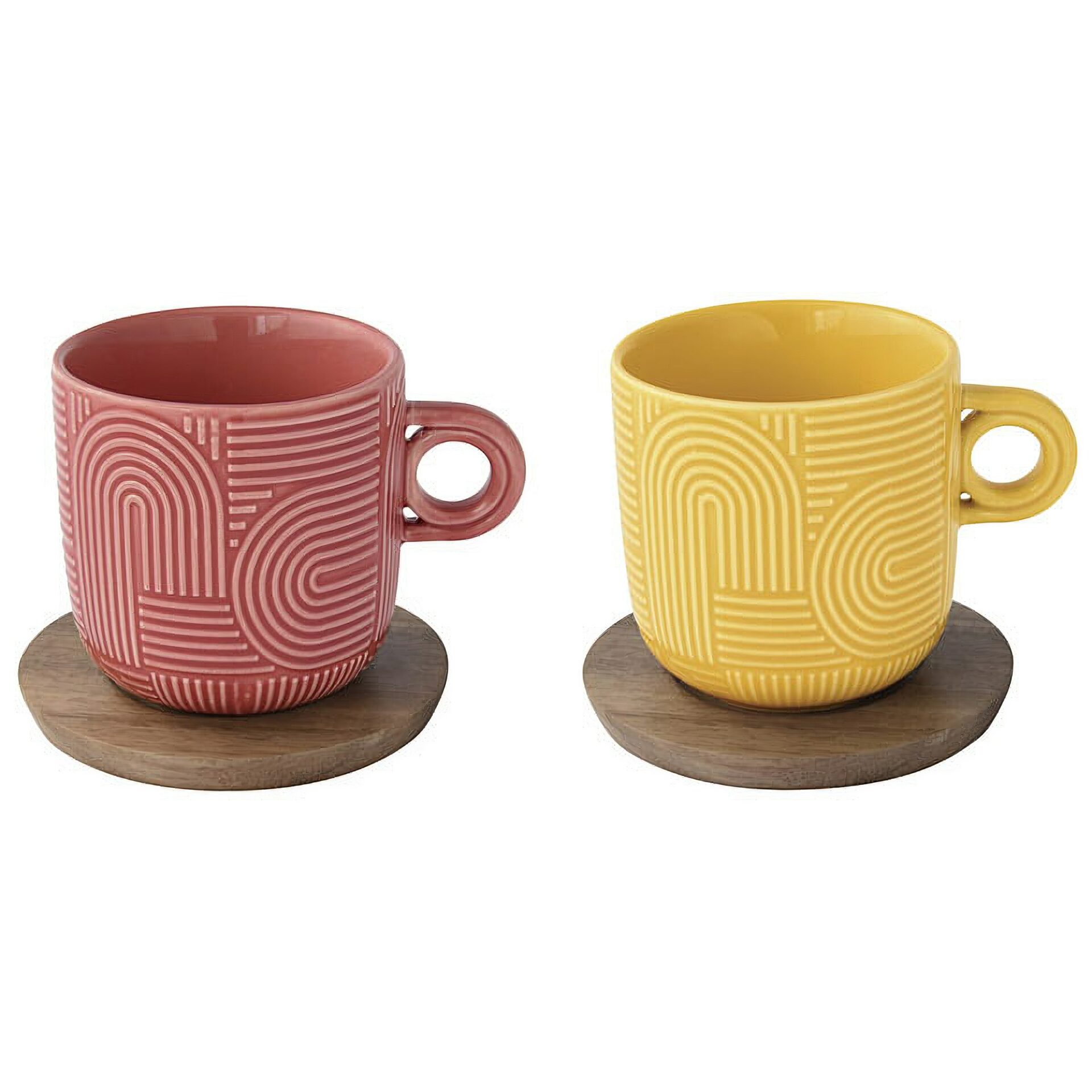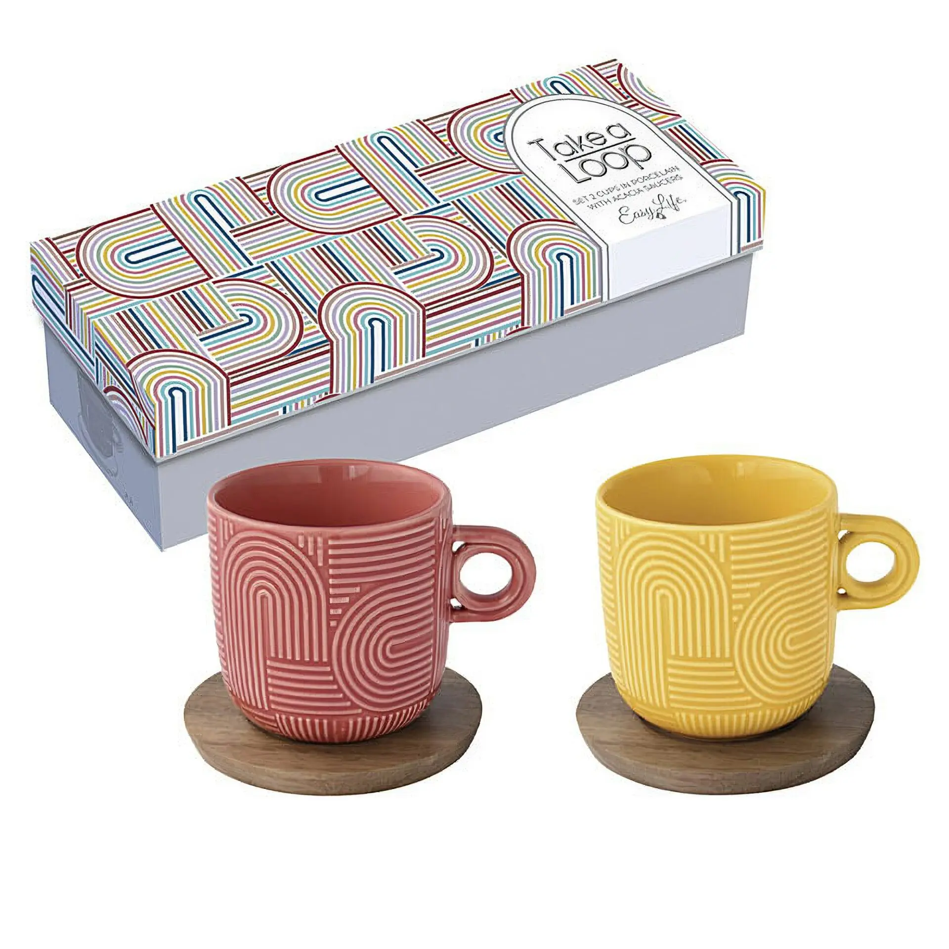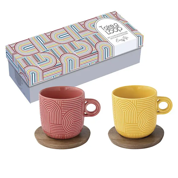 Porzellanbecher – Take a Loop – 250ml – rot gelb kaufen – Stilvolles Set mit Holzuntersetzern
