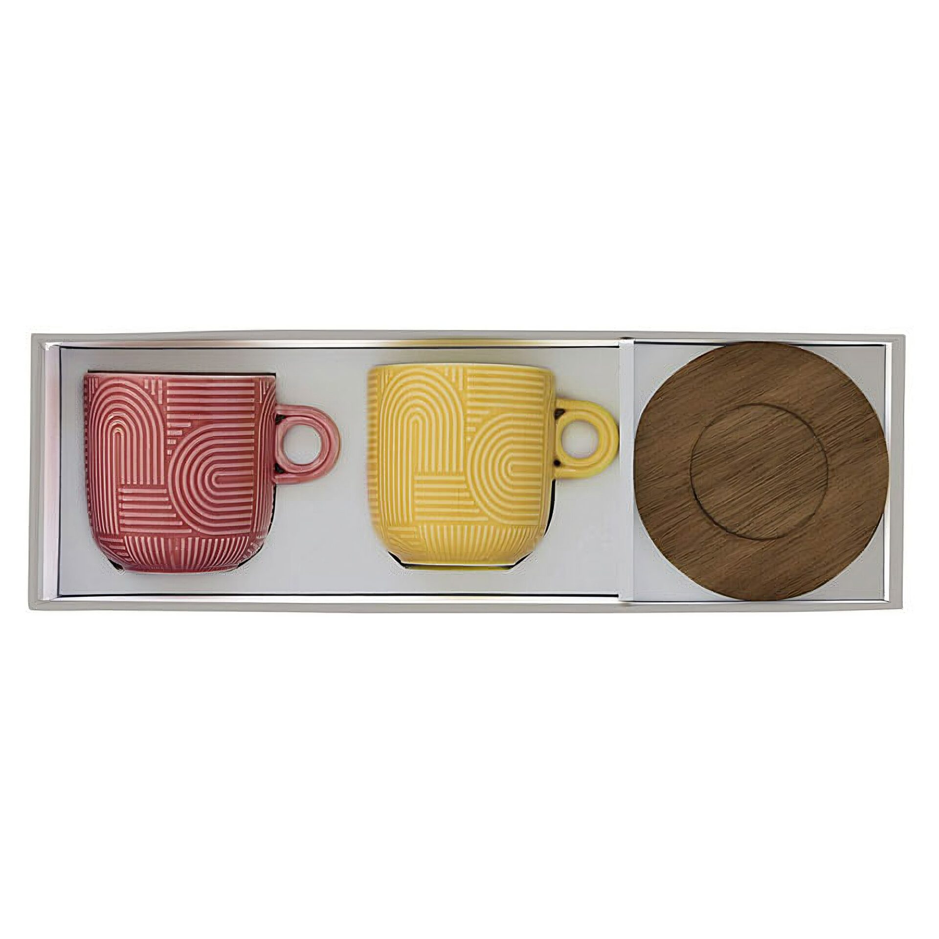 Die Kombination aus feinem Porzellan und der eleganten Prägung verleiht diesen hochwertigen Teetassen ein besonderes Aussehen. Die kräftigen Farben in Rot und Gelb setzen stilvolle Akzente auf jedem Tisch. Das runde Griffdesign sorgt für eine bequeme Handhabung und unterstreicht den modernen Look.