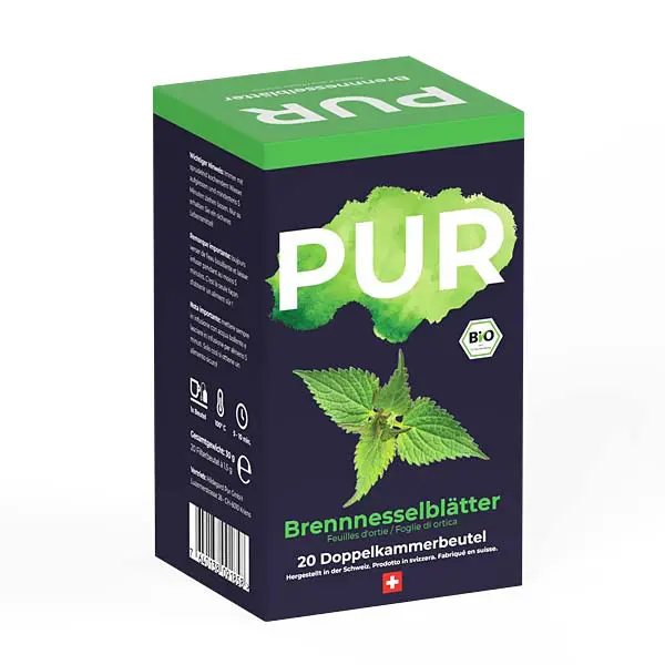 Dieser Brennnesseltee wird mit grosser Sorgfalt in der Schweiz verarbeitet. Die hochwertigen pflanzenbasierten Tees von PUR stehen für Reinheit und Natürlichkeit.