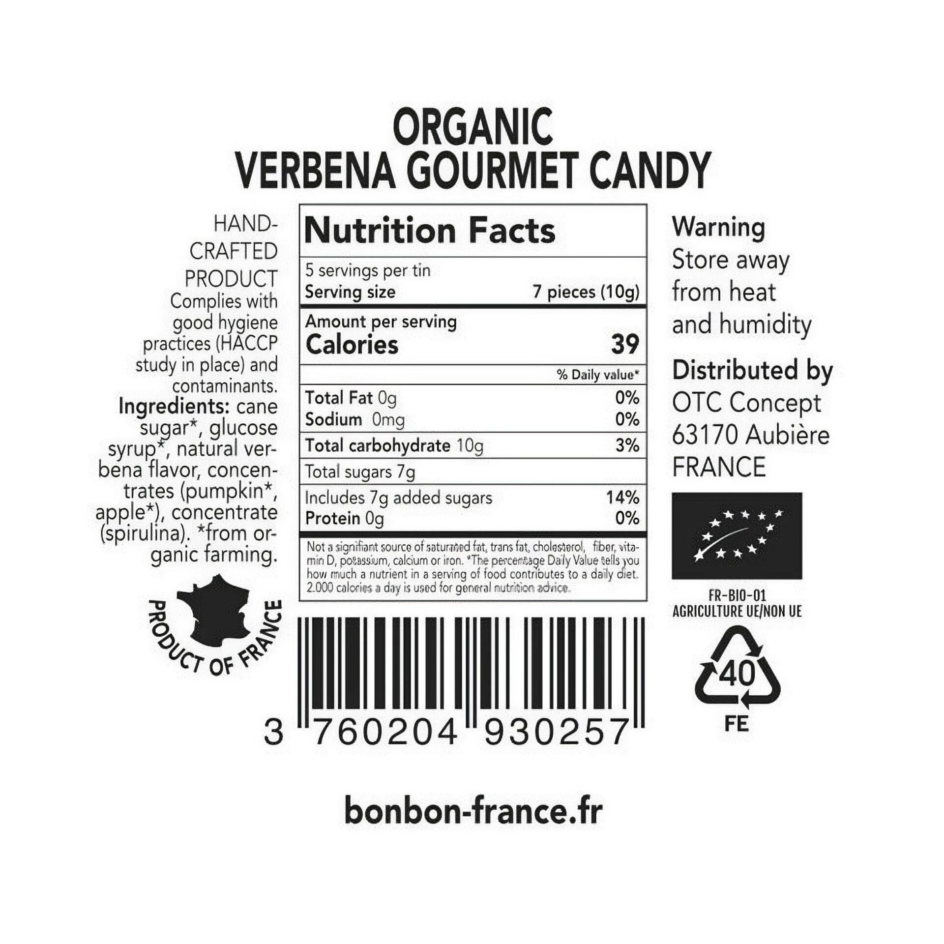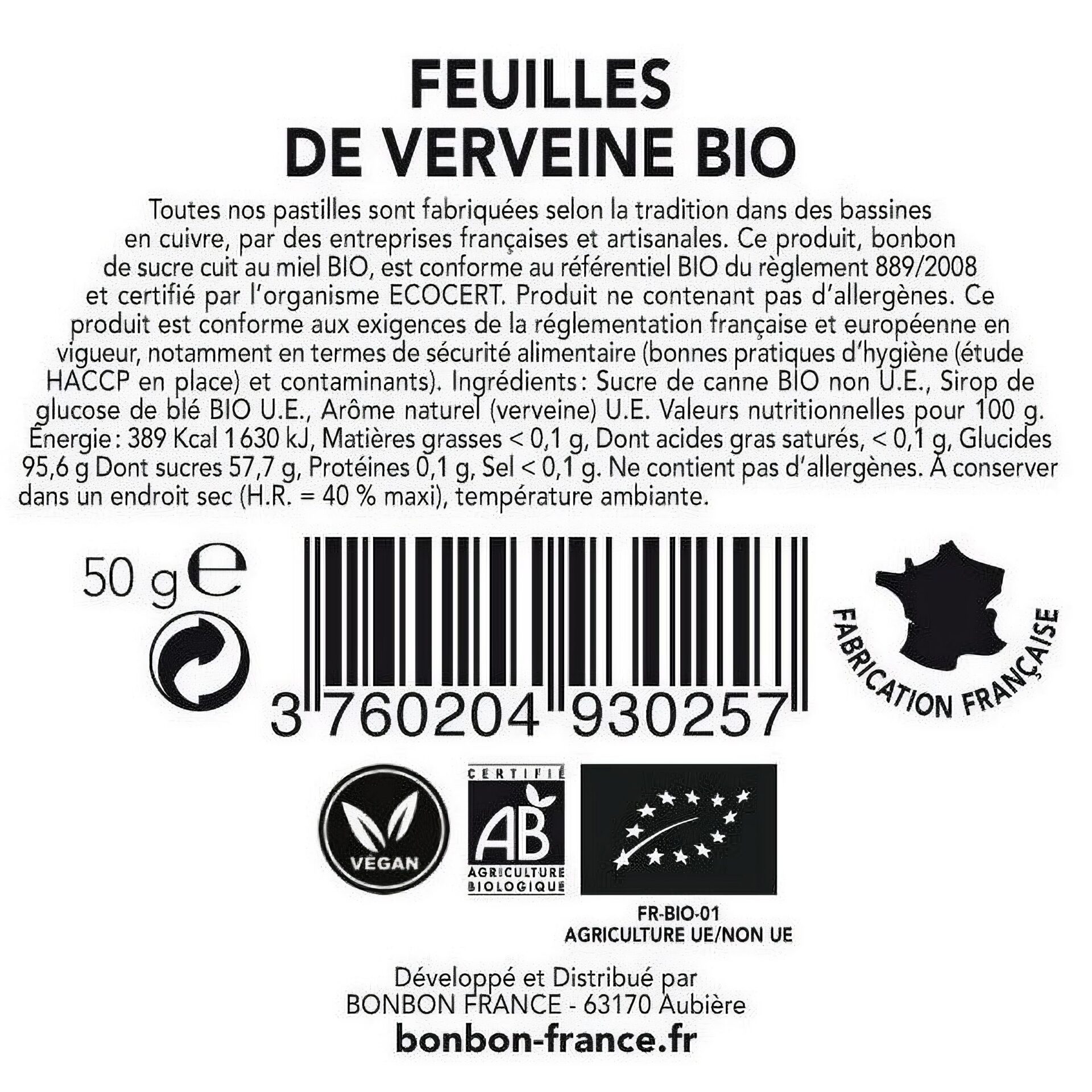Die hochwertigen Zutaten sind nach FR-BIO-01 zertifiziert, was den biologischen Anbau garantiert. Ökologische Bonbons, die mit Sorgfalt und unter Einhaltung strenger Standards produziert werden. Zudem enthalten sie keine Allergene, was sie für viele Menschen besonders verträglich macht.