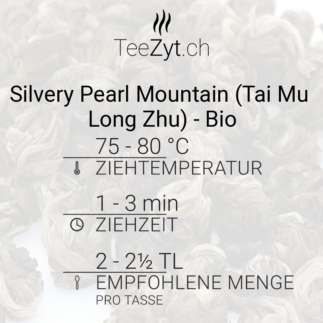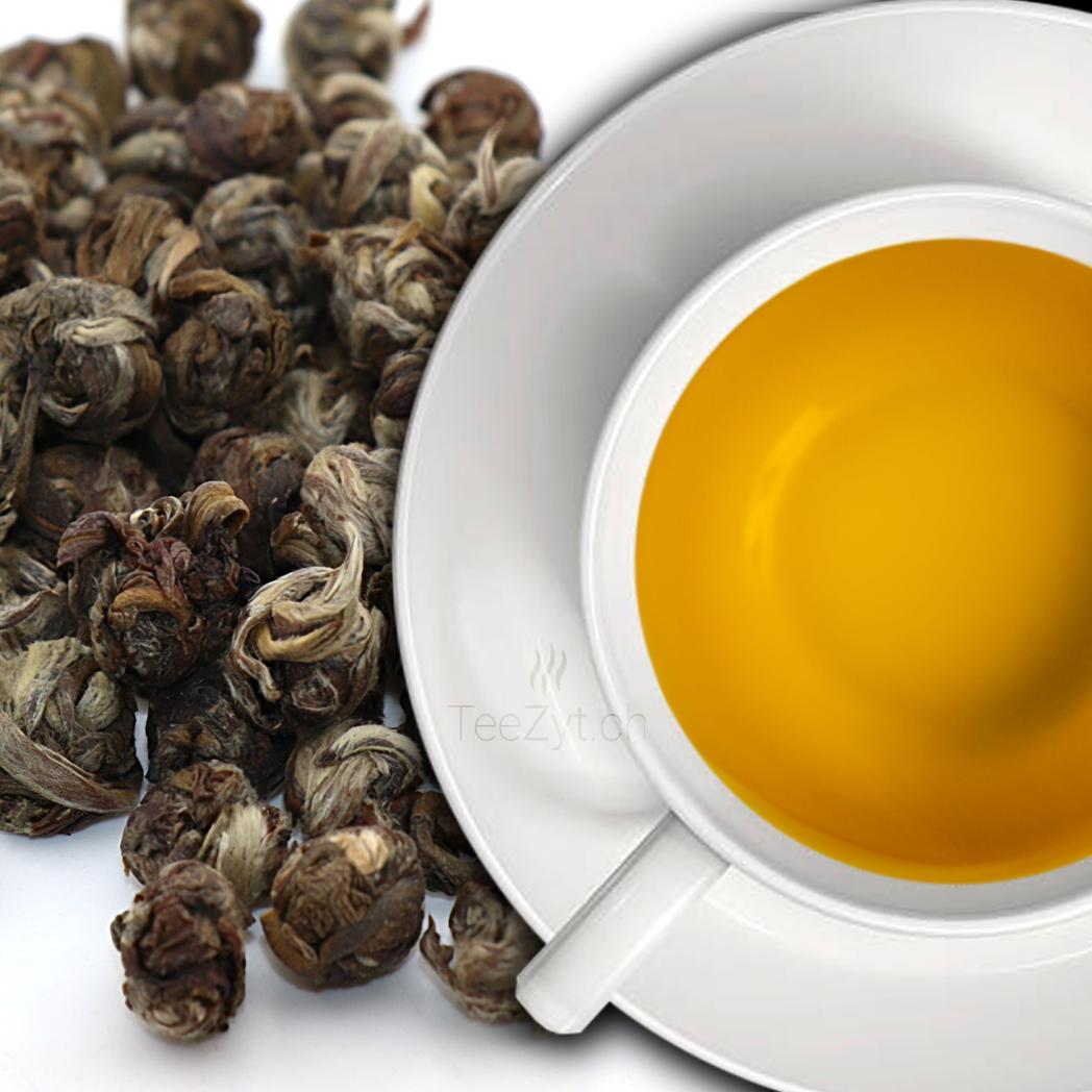 Diese besondere Rarität, bekannt als Tai Mu Long Zhu, erfreut sich in China grosser Beliebtheit und gilt als grüne Schwester der berühmten Jasmin Dragon Pearls. Die zarten Teeblätter werden sorgfältig von Hand zu kleinen, festen Kugeln gerollt.