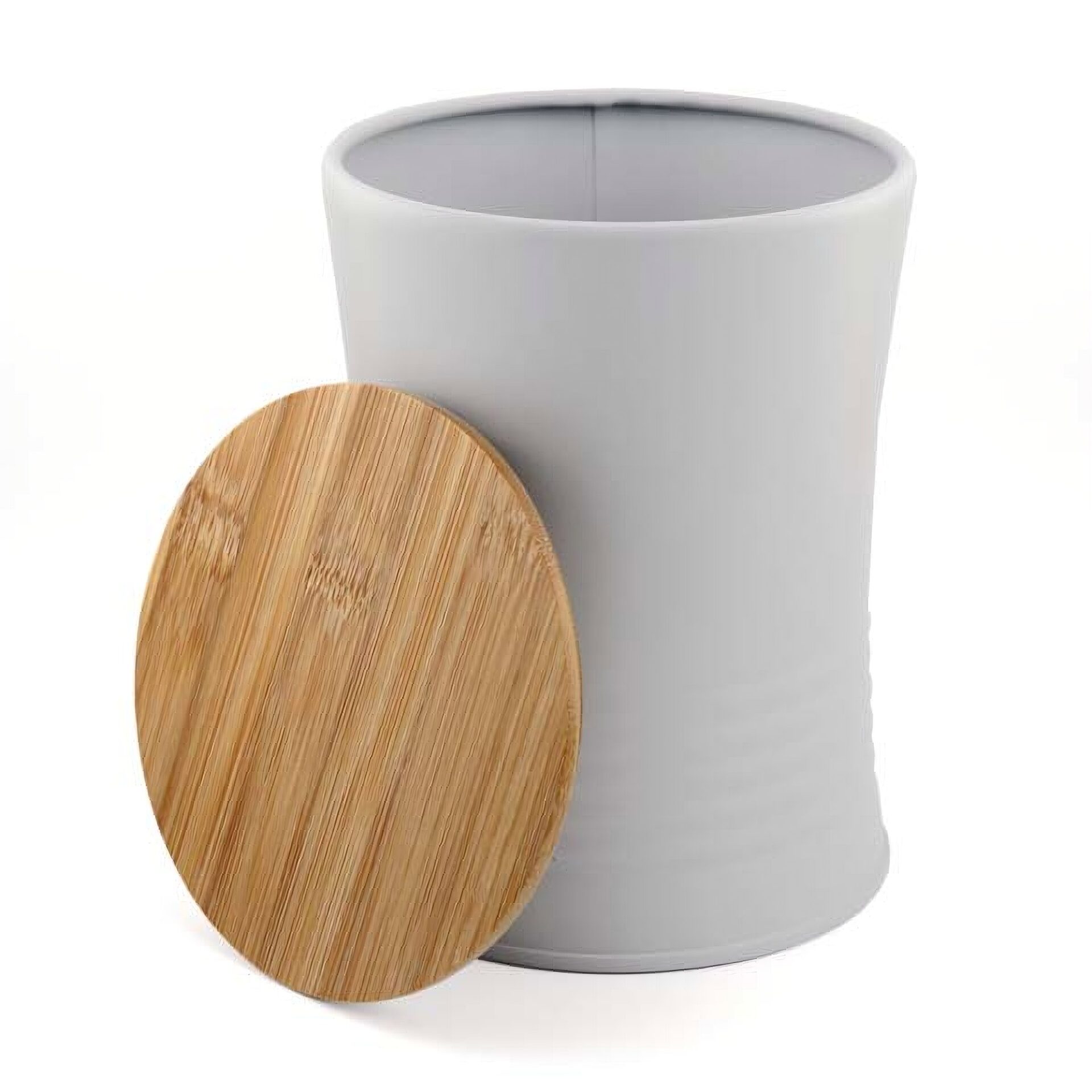Der pulverbeschichtete Stülpdeckel aus Stahl ist rostbeständig und pflegeleicht. Naturbelassener Bambus als Deckelmaterial ergänzt nicht nur optisch, sondern erfüllt auch funktionale Ansprüche bei der Küchenaufbewahrung. Die Kombination dieser Materialien schafft ein langlebiges Produkt mit modernem Ausdruck – ideal für nachhaltiges Haushalten.
